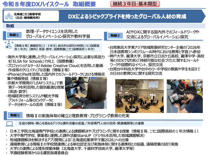 北海道ニセコ高等学校・ニセコ国際高校は、令和8年度文部科学省「高等学校DX加速化推進事業(DXハイスクール)」に採択されました。 継続3年目の取組の概要は次のとおりとし、両校の生徒を対象に事業を実施します。 事業の詳細は、取組概要の画像をクリックすると表示されます。